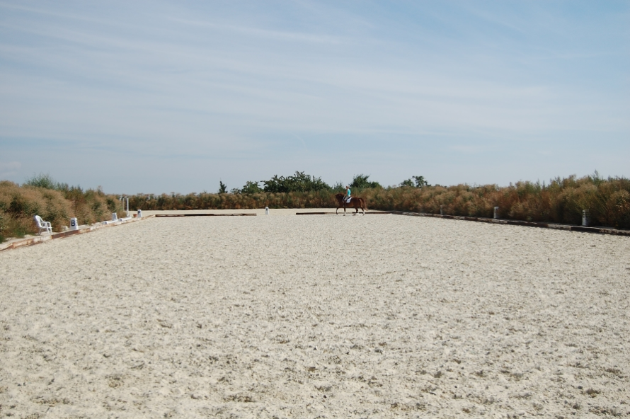 Der Boden besteht aus einem Außenplatz-Allwetter-Sand, auf dem 60er Viereck wurde noch das spezielle Dressur-Vlies beigemischt.