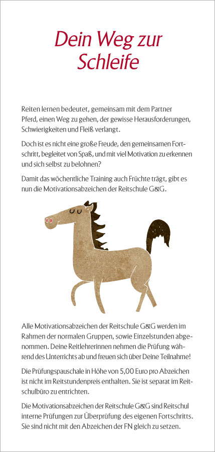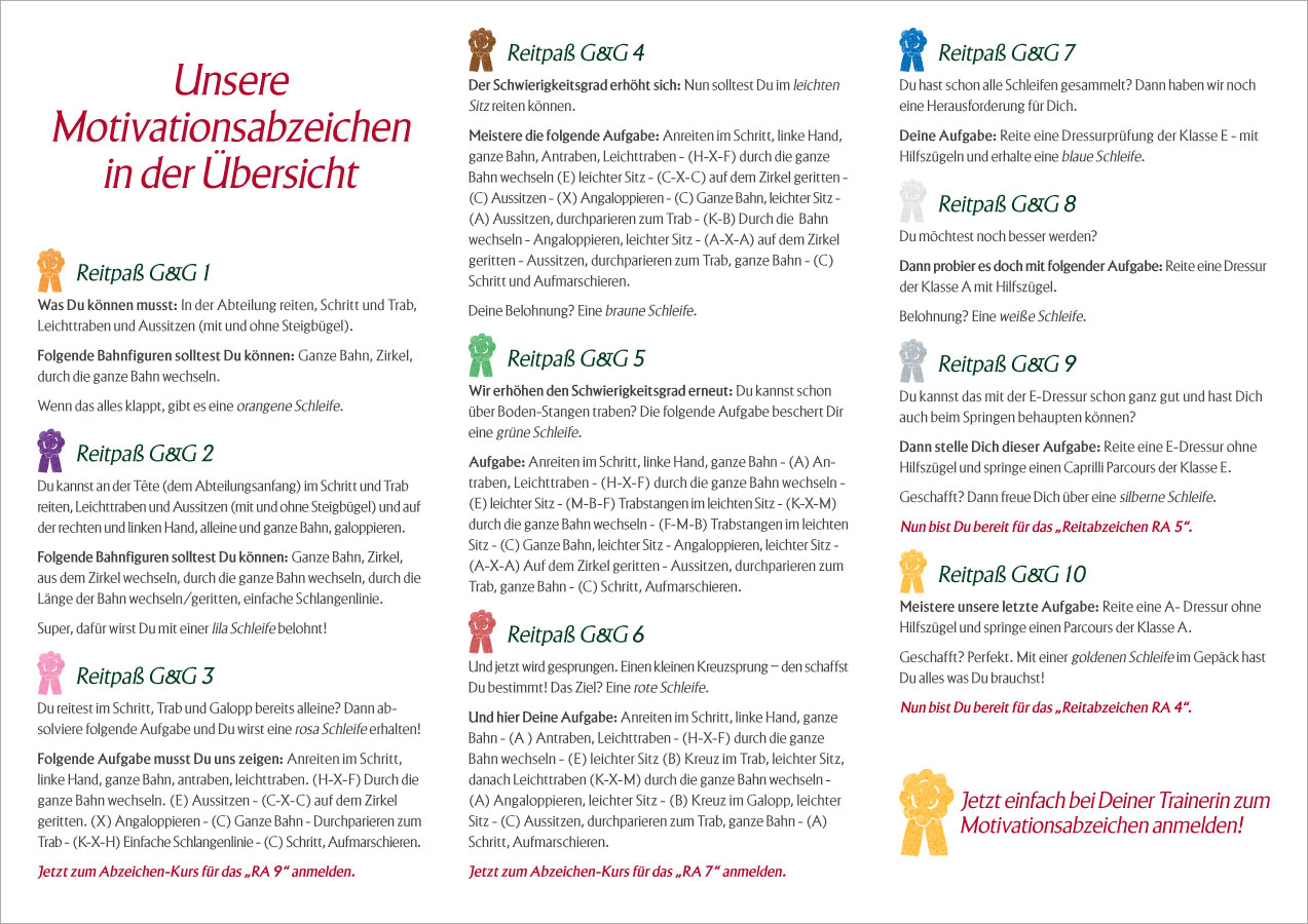 Jeder Reitschüler erhält den Flyer mit allen Informationen dazu sowie einem Kärtchen, auf dem die 10 Stufen abgestempelt werden können.