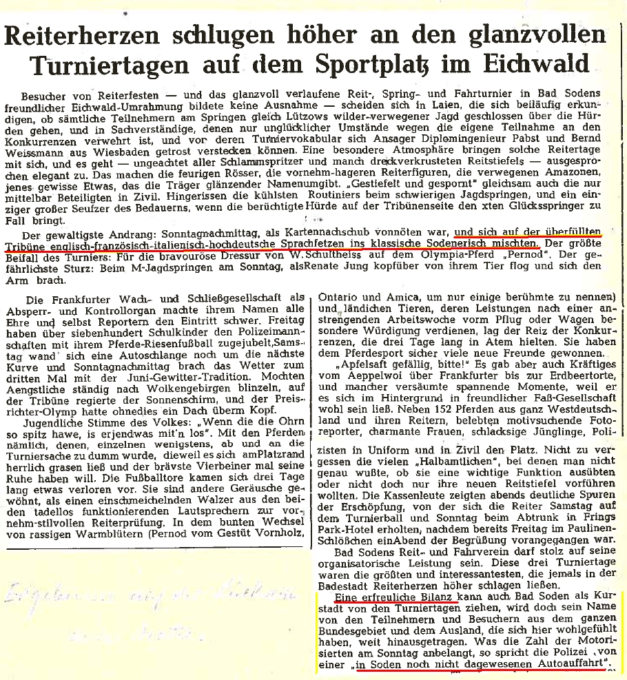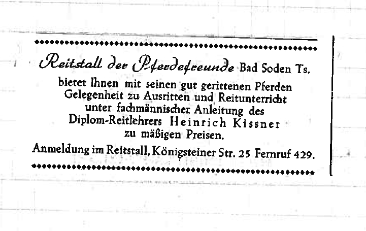 Und: Der "Reitstall der Sodener Pferdefreunde" wird gegründet, der sich dem Reit- und Fahrverein Bad Soden anschließt.