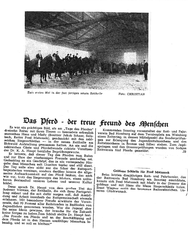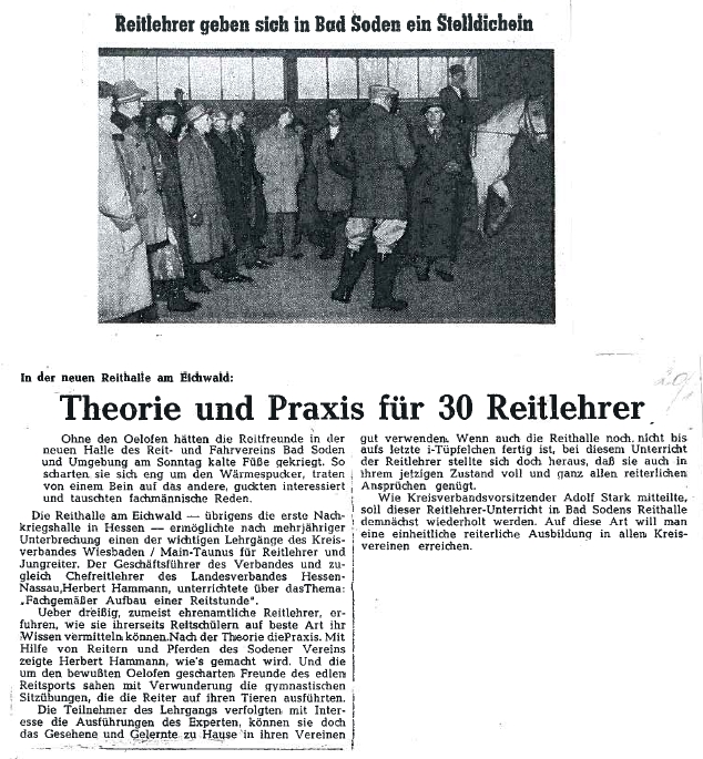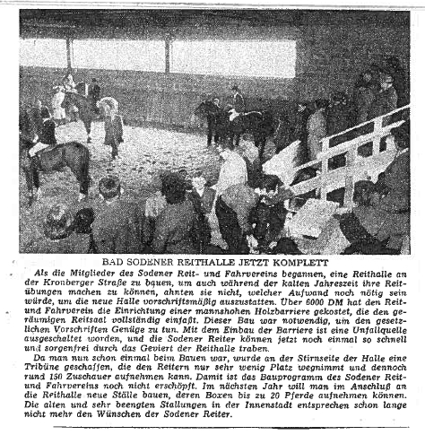 Schon im Oktober konnte "Der Tag des Pferdes" in der fast fertigen Reithalle begangen werden. In ganz Hessen ist dies die erste Reithalle, die nach dem Krieg gebaut wird. Hier findet nicht nur der tägliche Reitunterricht statt, sondern auch Lehrgänge des Kreisverbandes Wiesbaden-Main Taunus für Reitlehrer und Jungreiter z.B. zum Thema "Fachgemäßer Aufbau einer Reitstunde".
