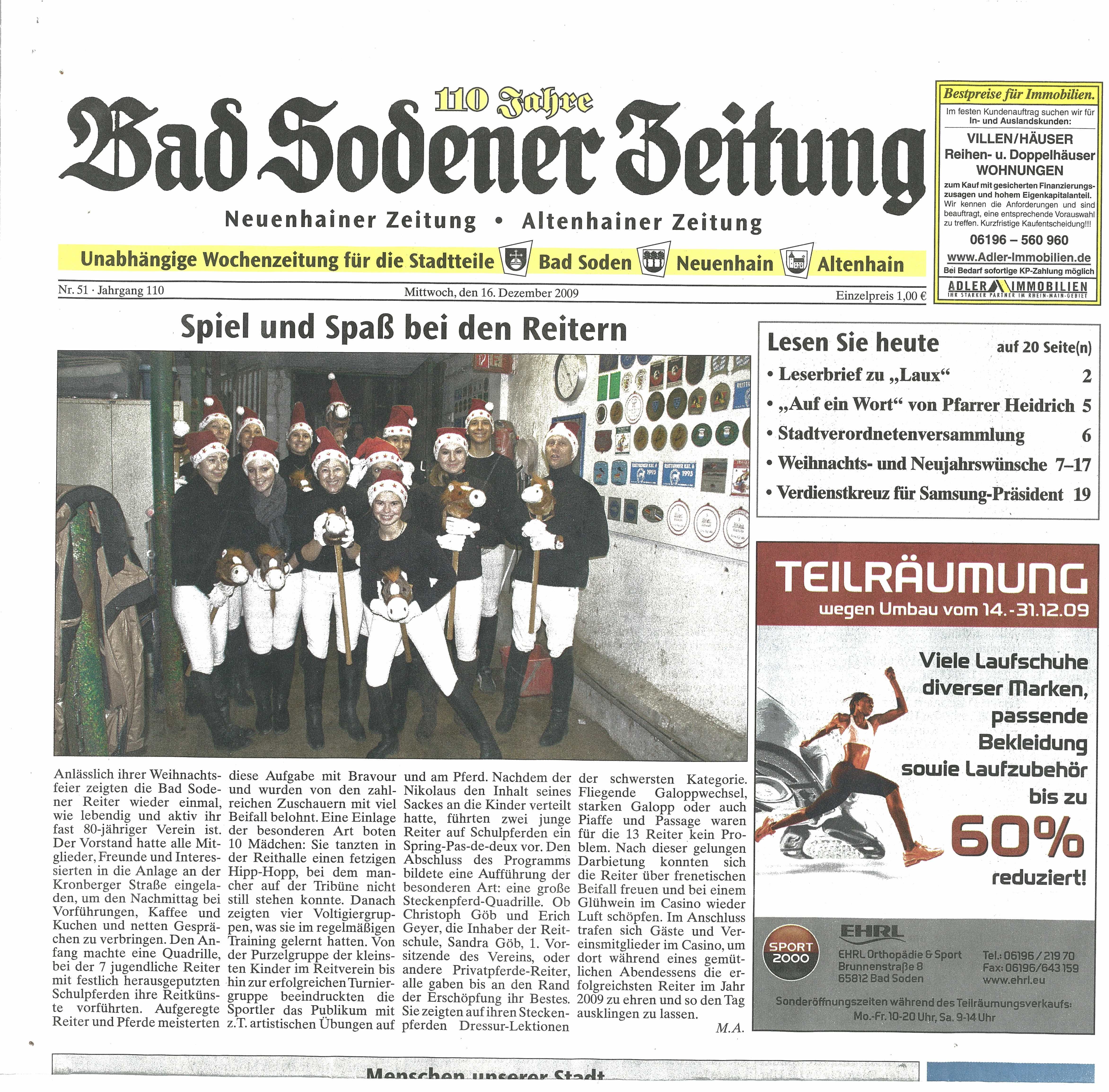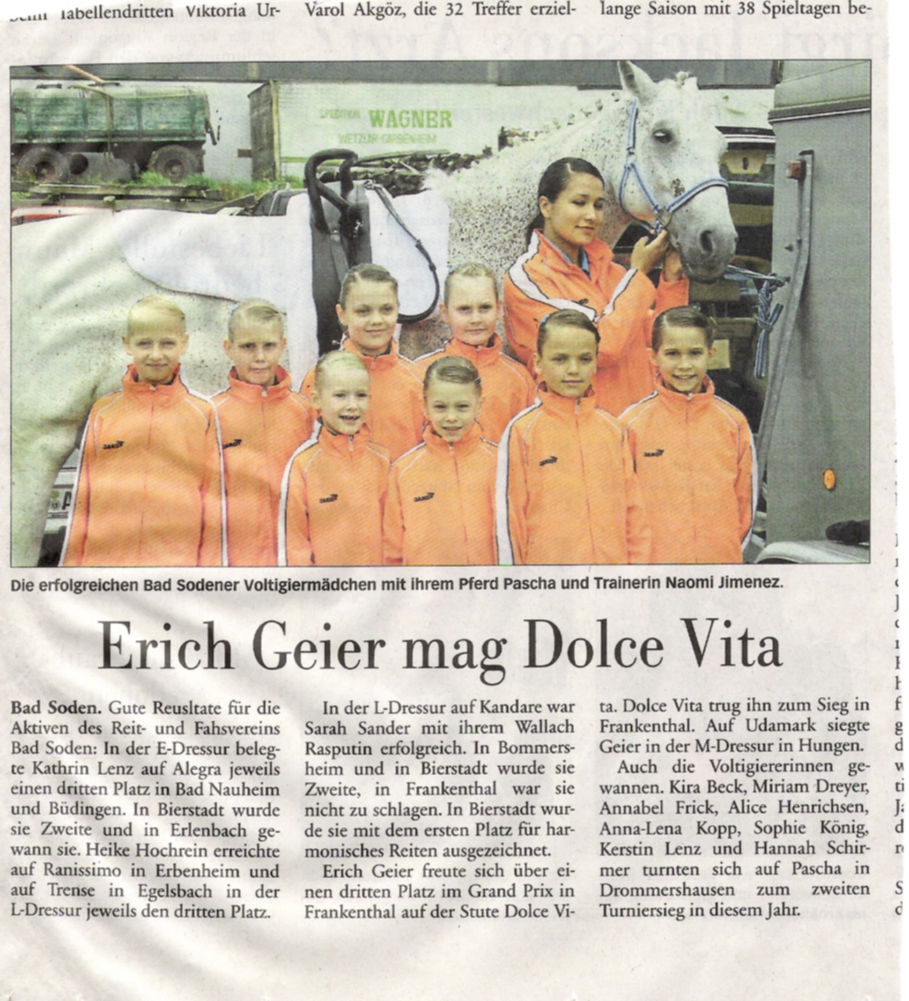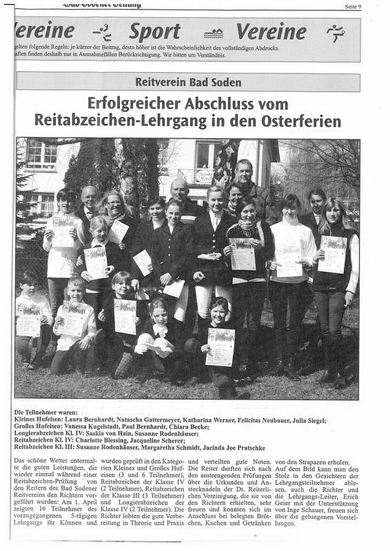 Sieben Mädchen, drei Trainerinnen und ein Pferd: Am Sonntag, den 10. Mai 2009, starteten die Voltigiererinnen der Gruppe „Bad Soden I“ und ihr Pferd Pascha auf dem Voltigierturnier in Neu Anspach und holten den Gruppensieg nach Hause.
