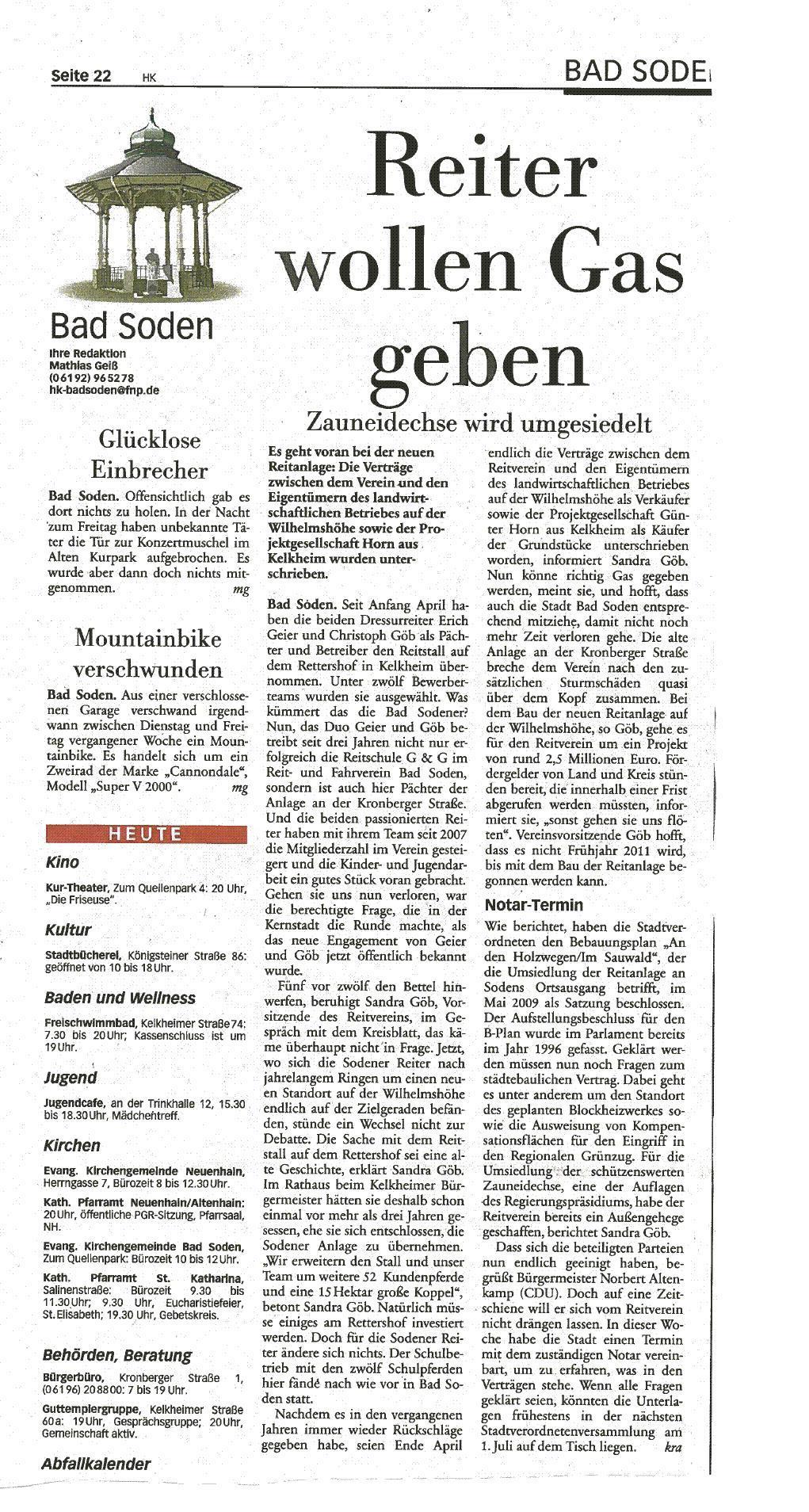 Die seit mehr als zehn Jahren laufenden Verhandlungen um die Verlegung der Bad Sodener Reitanlage von der Kronberger Straße auf die Wilhelmshöhe, scheinen einen Schritt vorangekommen zu sein.