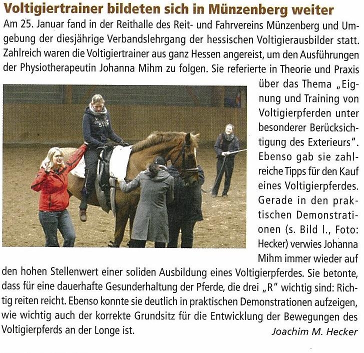 Am Verbandslehrgang der hessischen Voltigierausbilder nahmen unsere Voltigier-Trainer mit dem Volti-Pferd Ben teil. Auf dem Bild sitzt Meike Erbacher auf Ben, Kim Essel führt die Longe.
